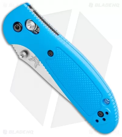 The Mini Griptilian features textured Blue Handle Scales (which are very strong and very lightweight). Double 410 stainless liners add strength to the knife handle. The blade is satin finished with a partially serrated edge. The pocket clip can be reversed for right or left handed people. The AXIS lock system makes the knife easy to open and easy to close (it operates identically for right and left handers). Features ambidextrous dual thumb-stud.