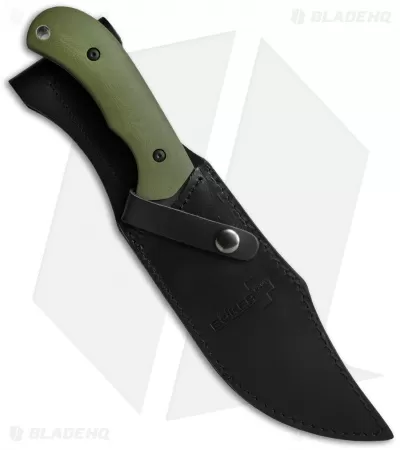 The Dragonslayer knife from Boker Plus was created by Norbert Müller, and it has the classic Bowie style matched with a grip empowering green G-10 handle. The blade has been acid washed and features decorative file work to complement the rugged look of the knife. A black leather sheath is supplied with the Dragon Slayer knife.