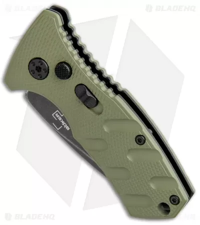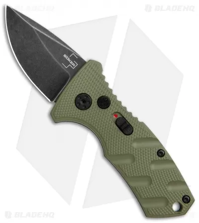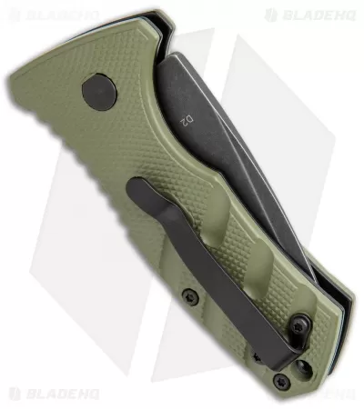 This Blade HQ Exclusive Boker Stubby Strike features a black stonewashed D2 blade and a OD green handle.