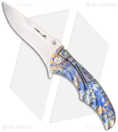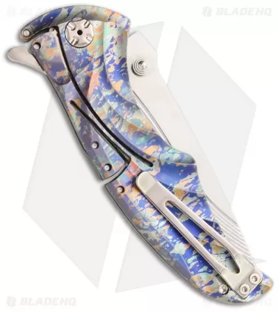 This Tighe Coon knife features a fluted, multi-color anodized titanium handle with Glenn Klecker’s NIRK locking mechanism. The hardware and pocket clip are satin finished. The drop point blade is fluted stainless steel with an integrated flipper and dual thumb studs. This Tighe Coon comes in a padded nylon pouch.