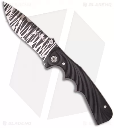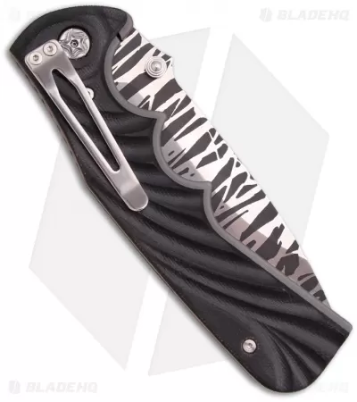 The Spicy Tighe custom folder from Brian Tighe feels great in hand and functions flawlessly. This Spicy Tighe features a stripe etched stainless steel blade with dual thumb studs, a push will activate the assisted opening mechanism. The frame is titanium, bead blasted for a nice matte finish. The handle has fluted black G-10 scales and a tip-down carry pocket clip.