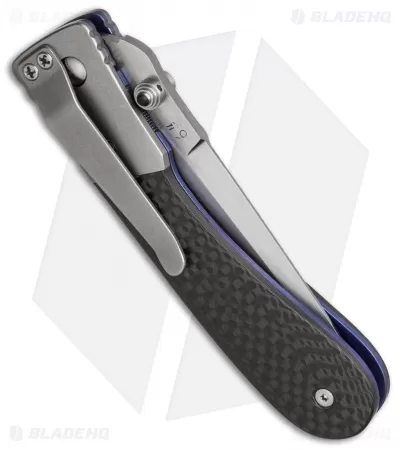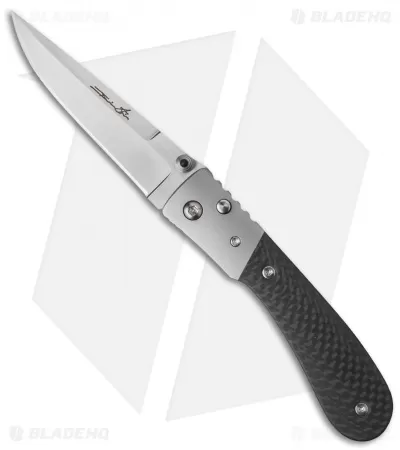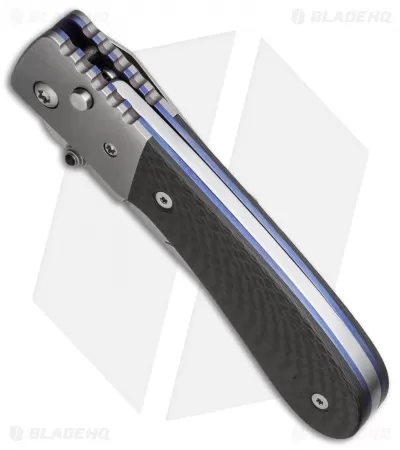 This rare dual action automatic from Brian Tighe features titanium liners and bolsters with carbon fiber handle scales. The blade comes in a clip point style and can be deployed automatically with a firing button or manually with thumb studs. Blue anodized liners and a polished back spacer add a nice custom touch to the design. This auto is from the Vanguard series and is marked with serial number 64.