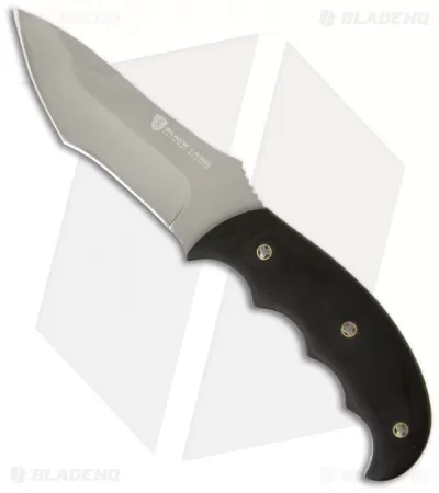 The Black Label Pandemonium fixed blade tactical knife has a 440 stainless steel blade that is bead blasted to a satin finish, with a hollow ground single edge in a trailing point shape. Rugged G-10 laminate scales with finger choils mount to the full tang construction with flush fasteners. The black Blade-Tech molded polymer belt sheath quickly adjusts to any angle and mounts easily on your belt, pack or web gear.