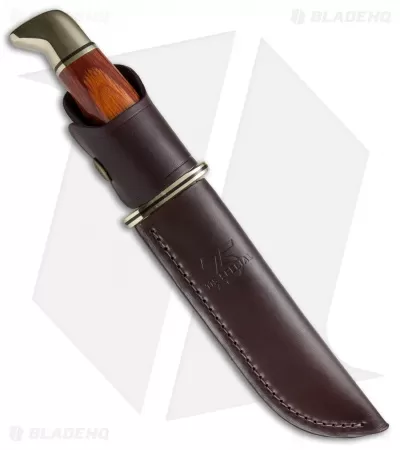 This 119 has been outfitted with a host of upgrades. It has the same highly functional design of the original with a cocobolo handle and a brass pommel and guard. The clip point blade is made from 420HC stainless steel with a satin finish. Item includes a leather belt sheath for everyday carry.
