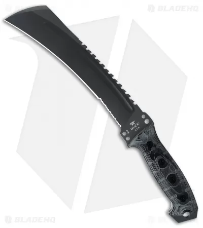 The Buck Talon is a huge survival, camping, tactical, whatever-you-can-throw-at-it knife. This one has a black blade and a molded polymer sheath. The knife has a partially serrated edge, and a sawback.