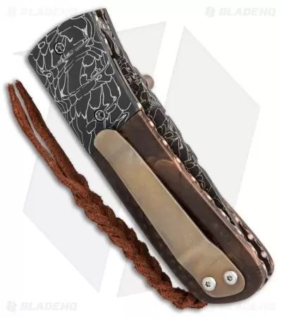 This Burr Oak C-MO folding knife has a Snake Skin Damascus steel blade with a thumb stud opener. The handle features Snake Skin Damascus bolsters and Juma scales over titanium liners. The steel back spacer is filed, along with the liners and blade spine. Comes fitted with a bronzed titanium pocket clip. This knife includes a signed certificate of authenticity.