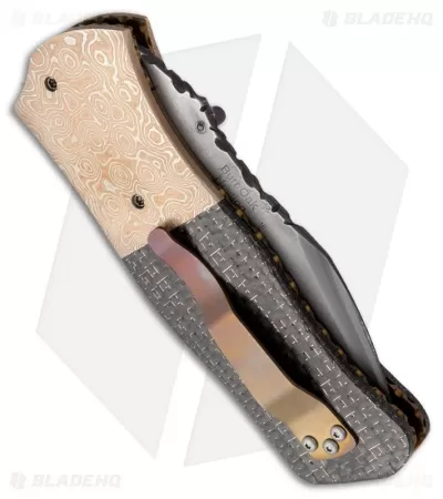 The Dreadnought is a new model from Burr Oak and this is #1! It features a 416/52100 Damascus San Mai steel blade with the thumb stud opener on front and stamped “Burr Oak Nevling” on back. The handle features mokume bolsters and lightning strike carbon fiber scales over titanium liners. The steel back spacer is filed, along with the liners and blade spine. This knife comes with a signed certificate of authenticity, dated 10/23/13.