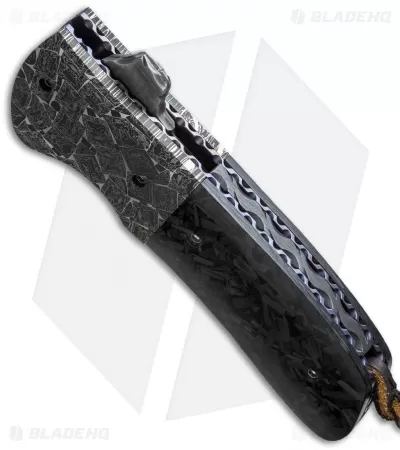 This Shard Flipper #1 is a stellar knife from Burr Oak with a San Mai 416/52100 Damascus steel drop point blade, “Zombie” mosaic Damascus bolsters, and shred carbon fiber scales. The titanium liners and steel backspacer are fileworked. This knife comes with a signed certificate of authenticity, dated 7/28/15.