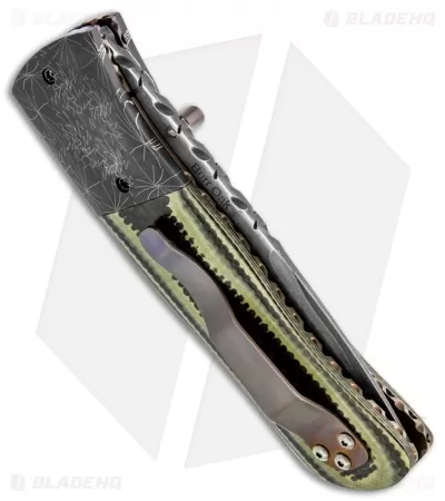 This Sidewinder II folding knife features a 416/52100 San Mai Damascus steel drop point blade with thumb stud opener on front and stamped “Burr Oak Nevling” on back. The handle features “Tesla” pattern Damascus bolsters and layered toxic green G-10/carbon fiber scales over titanium liners, with lock tab. The steel back spacer is filed, along with the liners and blade spine. This knife comes with a signed certificate of authenticity, dated 8/14/13.