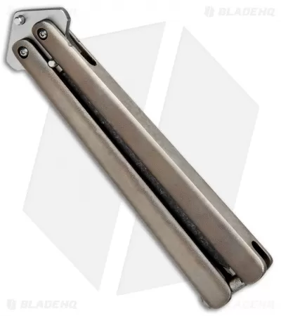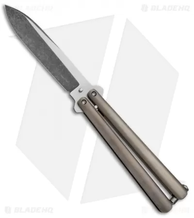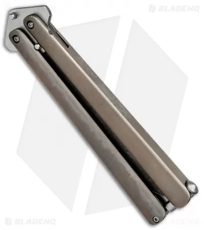 This Channel Balisong #4 is an impressive custom butterfly knife made by Chuck Gedraitis. It features a two-tone CPM-154 steel blade. The single-piece handles are made from bronze anodized titanium with an orange peel texture and a turned latch. Comes in a padded zipper pouch.