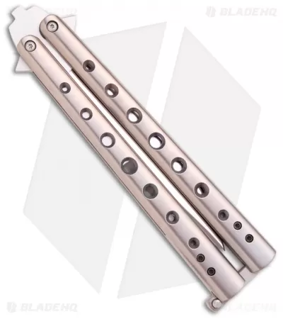 The Chuck Gedraitis Balisong #61 has drilled titanium handles with blue anodized chamfer accents. Zen pins and stainless spacers. All surfaces are satin finished. The blade is 154-CM stainless steel and weehawk patterned. This butterfly knife doesn’t have bushings, but flips great.
