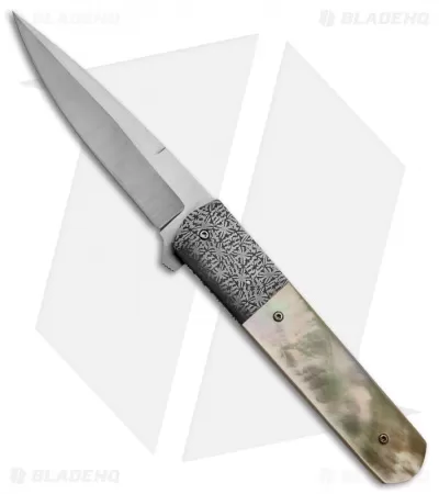 This Stileto Flipper is yet another fine creation from Chuck Gedraitis. It has mosaic Damascus bolsters from Dave Lisch and rich gold lip pearl scales. Satin finished titanium liners and lock tab along with a blue anodized and filed back spacer. The blade is hollow ground CPM-154 steel with a flipper opener.