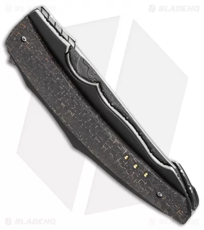 The Ilusion Flipper from Corrie Schoeman is an impressive folding knife design. It has a lightning strike carbon fiber handle over a thin black G-10 scale. The liners and titanium backstrap are filed and feature with Ruby & Citrine inserts on the spacer. The modified drop point style blade is Alabama Forge Damascus steel. The action on this knife is super smooth with a ball-bearing pivot and it has an excellent build.