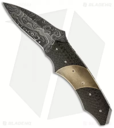 The Impact Flipper knife from Corrie Schoeman is a unique folder. The handle features stainless steel liners with lightning strike carbon fiber scales. The liners and titanium backstrap are filed with Ruby inserts on the spacer. The modified drop point style blade is Alabama Damascus steel with a filed spine. Pictures above are of the actual knife for sale. This knife was made in February 2013.
