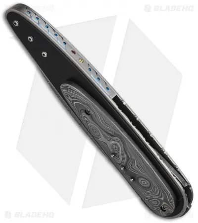 This Large Raindrop folder has a titanium liner lock handle with a black G-10 scale and Damascus onlay. The titanium liners are filed along with the back spacer. The Damascus steel blade has a fileworked spine and the ball-bearing pivot provides smooth, effortless action.