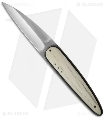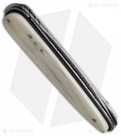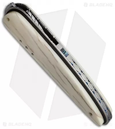 The Large Raindrop folder from Corrie Schoeman offers precision craftsmanship and a collectible design. This model has a satin finished, ATS 34 steel blade and giraffe bone scales. The ball-bearing pivot provides smooth, effortless action. It has a titanium liner lock handle with black G-10 onlays. This knife has been embellished with filework on the blade spine, liners and back spacer. A pearl inlay on the spine of the blade adds an elegant finishing touch to the piece.