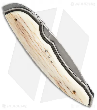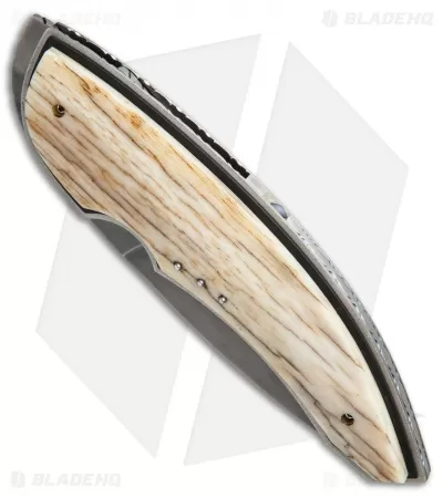 The Panerai Flipper knife from Corrie Schoeman is an impressive design. The handle features giraffe bone over a thin black G-10 scale. The liners and titanium backstrap are filed and feature an abalone insert on the spacer. The modified spear point style blade is 1095 steel that has been heat treated to form a Hamon blade. The action on this knife is super smooth with a caged ball-bearing pivot and it has an excellent build.