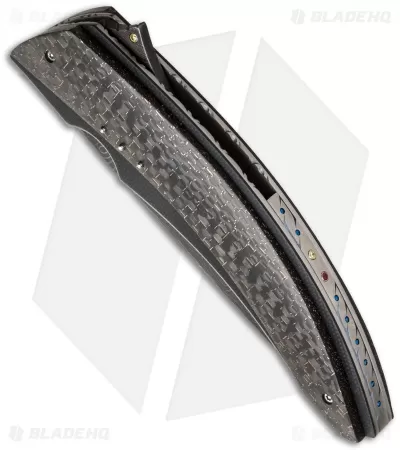 The Panerai Flipper knife from Corrie Schoeman is an impressive design. The handle features lightning strike carbon fiber over a thin black G-10 scale. The liners and titanium backstrap are filed and feature with Ruby & Citrine inserts on the spacer. The modified spear point style blade is Texas Steel Damascus with a filed spine and a citrine jewel insert on the flipper. The action on this knife is super smooth with a ball-bearing pivot and it has an excellent build.