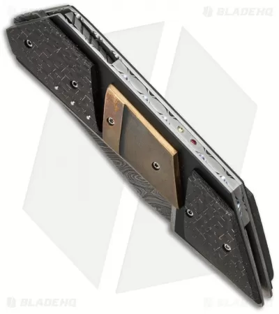 In his own style Corrie Schoeman has created this collection-grade flipper and it’s sure to get noticed. This Persian knife has a modified tanto style blade with a reinforced tip and a unique upper grind. The Alabama Forge Damascus steel blade has a diagonally filed tang and spine that provides traction for the front flipper. Ball-bearings at the pivot enable consistent, reliable one-hand opening. The handle is built off a titanium liner lock frame with G-10 underlays setting the backdrop for the lightning strike carbon fiber and bronze onlays. Consistent with Corrie’s other fine knives, this folder is outfitted with a filed titanium back spacer and features Ruby and Citrine gem inserts.