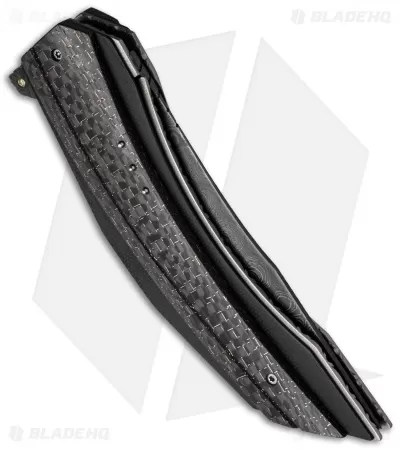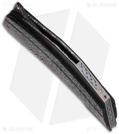 This Persian flipper another exceptional custom knife from Corrie Schoeman. The upswept blade is made from Texas Steel Damascus. A flipper, in tandem with the ball-bearing pivot, provides smooth, effortless action. Lightning strike carbon fiber and black G-10 onlays sit atop the titanium liner lock frame. Filework on the blade spine, liners and back spacer. Includes ruby and cintrine inserts.