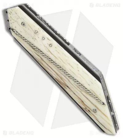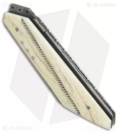 The T-Mate Flipper is an intriguing design from Corrie Schoeman. This model has a giraffe bone handle over a thin black G-10 scale. The liners and titanium backstrap are filed and feature with abalone inserts on the spacer. The action on this knife is super smooth with a ball-bearing pivot and it has an excellent build.