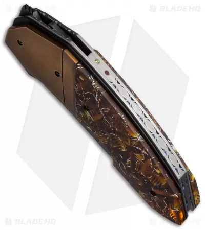 The X-Pert flipper from Corrie Schoeman offers a collectible design and an unparalleled fit and finish. This model has a Hamon finished blade and a stunning resin handle with bronze bolsters. The ball-bearing pivot provides smooth, effortless action. It has a titanium liner lock handle with black G-10 onlays. This knife has been embellished with filework on the blade spine, liners and back spacer. Ruby and Citrine gems are set in the titanium back spacer, adding an elegant finishing touch to the piece.