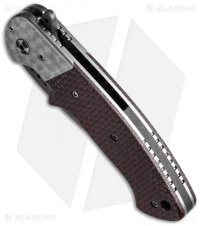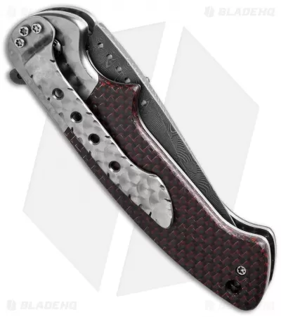This custom Crawford Kasper flipper is a boast-worthy composition of fine materials and top-notch craftsmanship. It features a basket weave Damascus steel drop point blade with flipper opener. Stand-out engine turned titanium liners, bolsters and pocket clip are complemented with red lightning strike carbon fiber scales and a black carbon fiber back spacer.