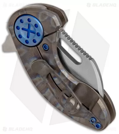 This Nano Flipper model sports a heat anodized titanium handle with blue hardware and a stonewashed blade.
