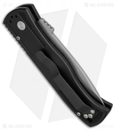 This knife features a black anodized aluminum handle with a knurl grip, safety and reversible tip-up/down pocket clip. The spear point blade is stonewash finished 154-CM stainless steel with a plain edge.