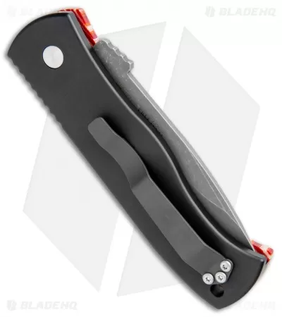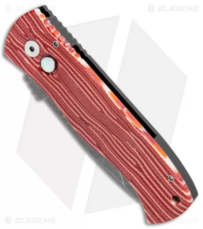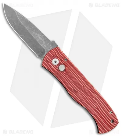 This Emerson/Pro-Tech CQC-7 automatic knife features a red grain micarta front scale and a mosaic pin push button insert with a black anodized aluminum frame. Includes a pocket clip. The drop point style blade is acid stonewash finished 154-CM stainless steel.