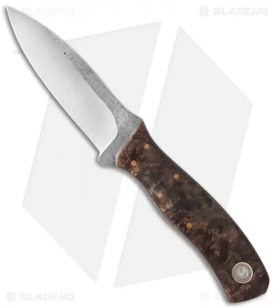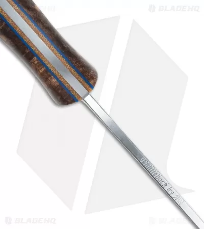 This ASP knife has maple burl scales with natural Micarta liners and blue pinstripes. Convex ground O1 steel full-tang blade. Fiddleback Forge fixed blades are a real treat for those looking to acquire a premium handmade knife with an emphasis on comfort in hand, efficient blade dynamics, and a traditional style. Fiddleback Forge has made a name by crafting knives that look and feel great.