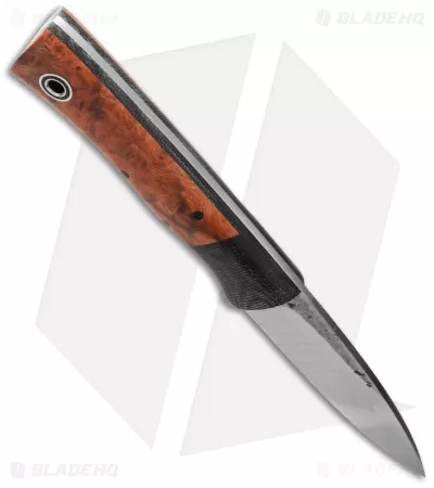 The Kephart fixed blade is based on the popular American knife pattern used by Horace Kephart, an early 20th century outdoorsman. Fiddleback Forge has added some great curves to the knife while maintaining the traditional spear point blade profile. This Kephart has a black canvas Micarta bolstered Ironwood handle with black liners. The straight full-tang blade is A2 steel. Sheath not included.