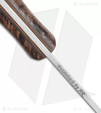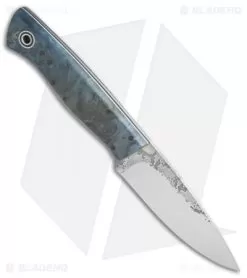 This Monarch knife has maple burl scales with a natural Micarta liner and blue pinstripe. Convex ground O1 steel full-tang blade. Fiddleback Forge fixed blades are a real treat for those looking to acquire a premium handmade knife with an emphasis on comfort in hand, efficient blade dynamics, and a traditional style. Fiddleback Forge has made a name by crafting knives that look and feel great.