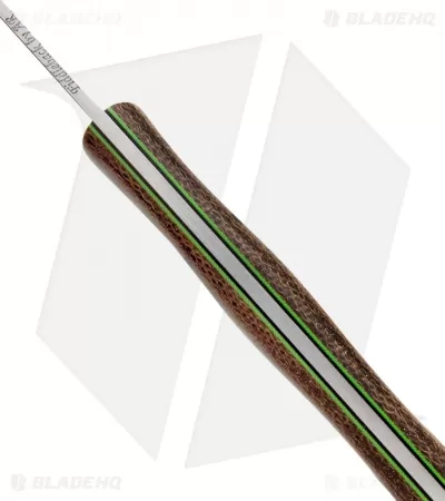 The Recluse is a hardworking knife for all things bushcraft. This model has a terracotta burlap Micarta handle with black liners and lime pinstripes. The O1 steel blade has skeletonized full tang construction for optimal balance in hand. Sheath not included.