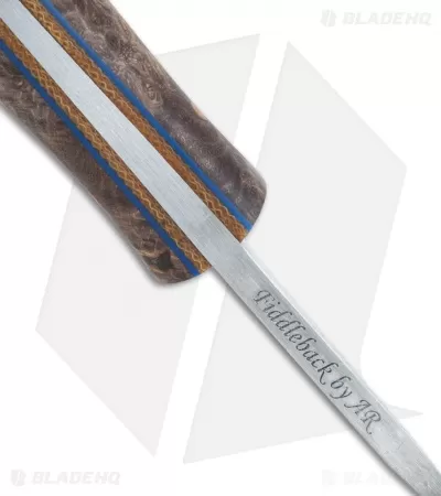 This Runt knife has black ash burl scales with a natural Micarta liner and blue pinstripe. Convex ground O1 steel tapered full-tang blade. Fiddleback Forge fixed blades are a real treat for those looking to acquire a premium handmade knife with an emphasis on comfort in hand, efficient blade dynamics, and a traditional style. Fiddleback Forge has made a name by crafting knives that look and feel great.