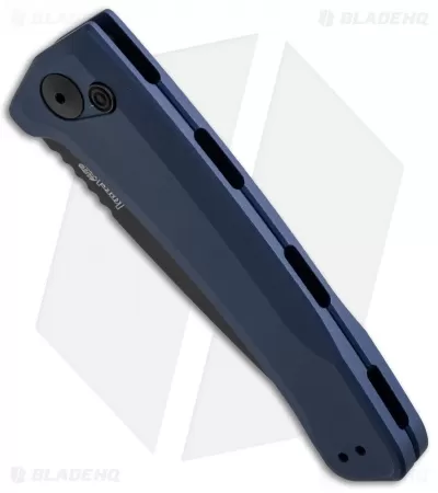 This Launch 3 has a black DLC coated CPM-154 steel blade with a slight upper bevel. The blue anodized aluminum handle has a black finished pocket clip, hardware, and bulls-eye ring pattern firing button.
