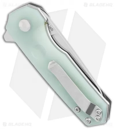 The Kizer Lieb is a small flipper knife designed by Azo. It is a liner lock knife with a blue pivot collar and G-10 handle scales. This Lieb has a jade green handle. The Wharncliffe blade is satin-finished N690. It includes a tip-up pocket clip.