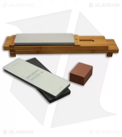 The Kramer 6 Piece Sharpening Kit is a one-stop tool for getting even the dullest of knives scary sharp once again. It includes 400, 1000, and 5000 grit stones.
