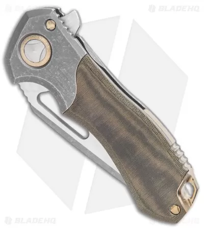This Marfione Custom Protocol boasts green micarta scales with apocalyptic-finished titanium bolsters and bronze titanium hardware. The blade is hollow-ground CTS-204P with a two-tone apocalyptic finish and a plain edge. The titanium pocket clip is engraved with “S. MARFIONE” and the Marfione dagger. On the inside of the backspacer the date of birth, 01/2020, and the serial number can be found.
