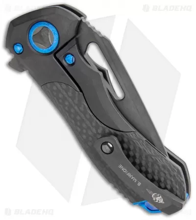This Marfione Custom Protocol boasts carbon fiber scales with vapor-blasted titanium bolsters and blue titanium hardware. The blade is hollow-ground CTS-204P with a black DLC finish and a plain edge. On the inside of the backspacer the date of birth can be found.
