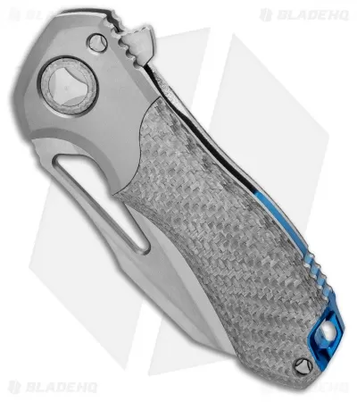 This Marfione Custom Protocol boasts Silver Twill Carbon Fiber scales with double vapor-blasted titanium bolsters and hardware with satin accents. The Wharncliffe blade is flat ground ultra premium steel. The titanium pocket clip is engraved with “S. MARFIONE”, the Marfione dagger, as well as the date of birth, 04/2021, and is where the serial number can be found.