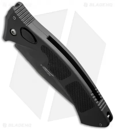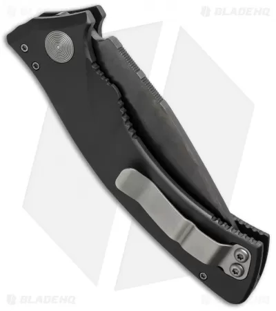 The Microtech Amphibian automatic knife opens via the push button on the front of the handle. It has a black anodized aluminum handle with knurled rubber grip inserts on the front and a tip-up carry pocket clip on the back. The blade is black finished 14-4CrMo steel with a partially serrated edge. It is stamped with the date 08/2002 and s/n 1240. This rare automatic will make a great addition to your Microtech collection!