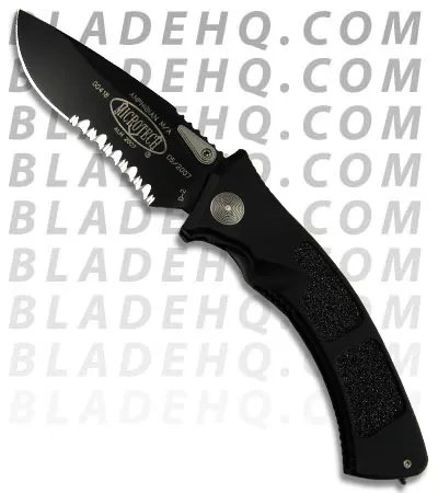 Super quality Microtech Amphibian manual knife. This knife opens via the thumb stud, left or right handed. Black handle and D2 black coated blade (partially serrated). Features glass breaker on the bottom of the handle. Pocket clip included.
