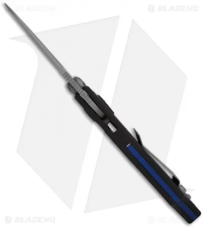 The Select Fire-M has an aluminum handle with carbon fiber inserts (front), tip-up pocket clip (back) and red or blue anodized back spacer up top (choose from drop-down box above). The nested locking liner tab is slick and functions solidly. The satin finished S35-VN stainless blade is reverse tanto styled with a 3.1 inch plain cutting edge and over-sized thumb studs. The blade features an index choil for choking up and notched thumb placement on the spine.