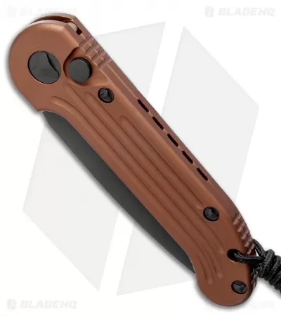 This model has a plain edge, black finished Elmax steel blade and tan anodized handle with tactical black hardware.