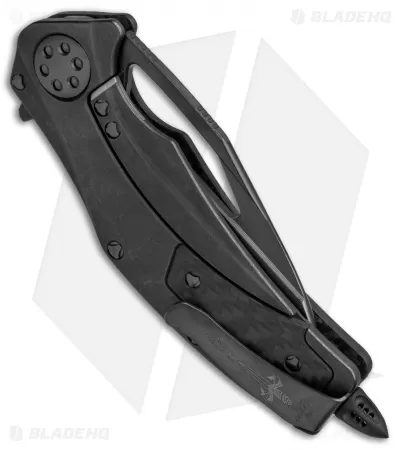 This collectible custom Mini Matrix from Microtech features a hand ground blade made from M390 steel with a mirror polished DLC finish. The handle is 30k layer carbon fiber with an Apocalyptic titanium framelock back, DLC hardware, and a carbon fiber inset. The pocket clip is marked with the Marfione Dagger, production date of 03/2017. A true collectors piece. Includes zipper case and Marfione box.