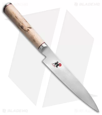 The blade is made from 101 layers of steel, ice-hardened to perfection and forged into a Damascus pattern. The handle is made of wood from the Karelian birch, the only wood ever used for a Faberge egg. The Miyabi Birchwood SG2 6″ Utility Knife is an elegant and tough kitchen tool!