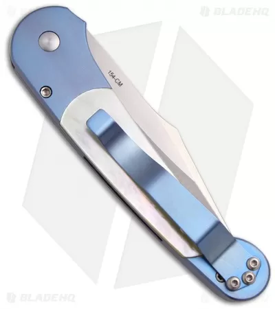 Although the Monaco’s handle is slim and sleek, once open it’s surprising how large the blade is and how much cutting real estate you actually have. The blade is satin finished 154-CM steel with a plain cutting edge. This Monaco has a custom blued titanium pocket clip.