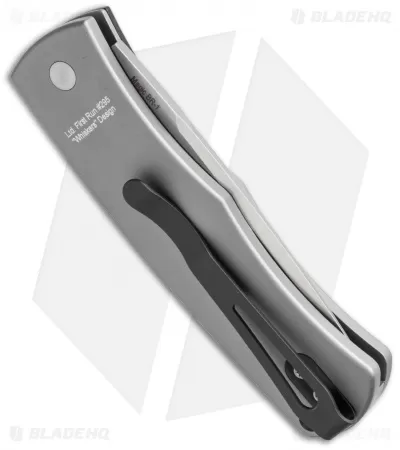 The Magic BR-1 has a stonewash finished 154-CM steel blade and gray anodized 6061-T6 aluminum handle with a patterned, black bolster release.