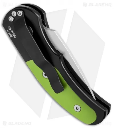 This J4 Runt has a satin finished 154-CM blade and black anodized aluminum handle with polished neon green G-10 inlays and a black pocket clip.